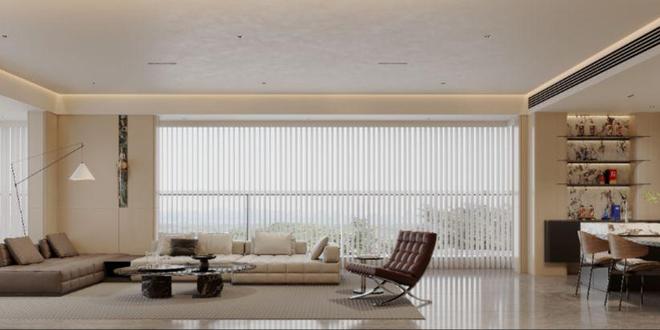 采用开放式设计,连接餐厅和厨房,形成一个流畅的活动空间。选择简洁大方的家具,沙发和茶几的组合突显空间的宽敞感。采用多层次的照明设计,包括主灯、射灯和落地灯,营造出温馨的氛围。通过简约的装饰画和绿植点缀,提升空间的艺术感和自然气息。