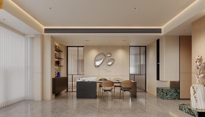 餐厅与厨房相连,便于家庭成员间的交流和互动。选择简约实木餐桌和舒适的餐椅,提升用餐体验。采用吊灯和辅助照明,营造温馨的用餐氛围。通过简洁的装饰品和桌布的选择,增强餐厅的温馨感。